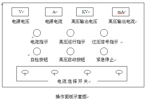 高压启动按钮——允许高压输出的按钮,该按钮按下后,高压运行指示灯亮,表明电源可以向负载输出电流,输出大小由电流选择开关控制。